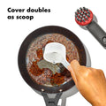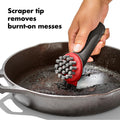 The ultimate cast iron scrubber, the OXO Outdoor Heavy Duty Brush with Cover can clean off burnt-on bits without a drop of soap or harming your hard-earned seasoning. (You can also use it with carbon steel and non-stick cookware.) The bristle pattern was designed to be able to tackle flat and ridged cookware, and the tip of the scraper has a metal scraper to chip off sticky grease or stubborn messes. The non-slip handle is compact for comfort and transport, and the cover doubles as a scoop while camping. Dishwasher safe.