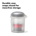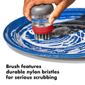 Whether it’s a campsite cookout, frying up fresh caught fish, the OXO Outdoor Soap Dispensing Brush with Storage Case can tackle any mess left behind. The palm-sized Brush has durable nylon bristles that are safe to use even on non-stick cookware, while the easy-press button dispenses just the right amount of soap each and every time. The convenient storage case includes an inner post to keep brush valve from dispensing soap while in storage. The case snaps shut to prevent it from accidentally opening. Replacement brush heads available. Dishwasher safe.
