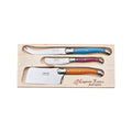 An authentic laguiole jean neron cheese set. Made in france from high-quality stainless steel, this 3 piece cheese set features a traditional cheese knife, pate knife and cleaver in a wooden gift box. This cheese set is perfect for entertaining, or indulging, and pairs beautifully with any of laguiole france's range of wooden serving boards. All authentic laguiole jean neron cutlery is made in france. Stainless steel, full-tang construction. Bright, stylish mixed colour resin handles comes in a wooden gift box.