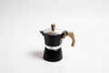 Matte black stove top coffee maker with a soft touch wood look handle.
