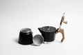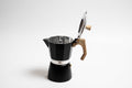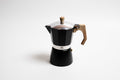 Matte black stove top coffee maker with a soft touch wood look handle.