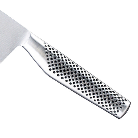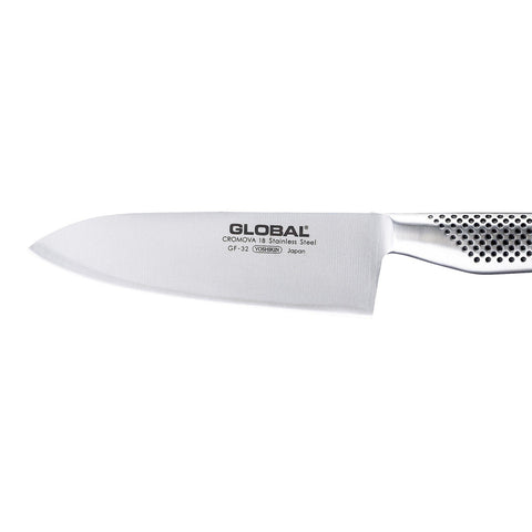 The GF-32 is made from forged CROMOVA 18 stainless steel, specially developed by GLOBAL® as it holds a razor-sharp edge and resists rust, stains and corrosion. Ice tempered and hardened to Rockwell C56-58, each knife is carefully weighted by filling the handles with sand to achieve the optimum weight and perfect balance. Other unique features include its smooth contours and seamless construction which eliminates food and dirt traps offering the ultimate in safety and hygiene. The acute 15-degree angle cutting edge provides unsurpassed performance and superior edge retention.