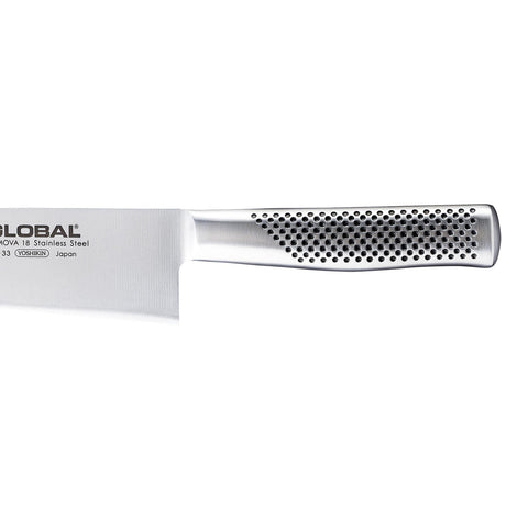 The GF-33 is made from forged CROMOVA 18 stainless steel, specially developed by GLOBAL as it holds a razor-sharp edge and resists rust, stains and corrosion. Ice tempered and hardened to Rockwell C56-58, each knife is carefully weighted by filling the handles with sand to achieve the optimum weight and perfect balance. Other unique features include its smooth contours and seamless construction which eliminates food and dirt traps offering the ultimate in safety and hygiene. The acute 15-degree angle cutting edge provides unsurpassed performance and superior edge retention.