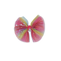 Inspired from Barbie! Add a splash of colour and sparkle with this Barbie Rainbow bow hairclip. Ombre rainbow mesh is gathered together creating 4 layers of soft fullness. The center features a small charm with the iconic Barbie logo.
