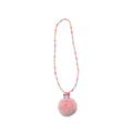 This pom pom bunny necklace from Pink Poppy is fun and colorful, with pale pink beads and rainbow bead accents, adorned with a fluffy pom pom bunny piece.