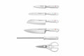 - 1x Paring Knife 9cm, 1x Serrated Utility Knife 14cm, 1x Santoku Knife 17cm, 1x Chef's Knife 20cm, 1x Honing Steel, 1x Shears, 1x Slim Knife Block.