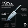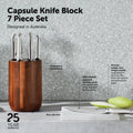 Contains: Asian Utility Knife 12cm, Utility Knife 15cm, East/West Santoku Knife 17cm, Bread Knife 20cm, Cook's Knife 20cm, Carving Knife 20cm, Capsule knife block