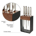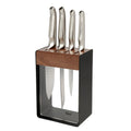 The limited edition 5 piece block set, a stylish home for your knives. The block’s casing is made from steel with a matte black finish and black walnut top section. A clear acrylic front panel gives you good visibility of the knives for quick selection whilst storing them safely.