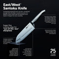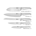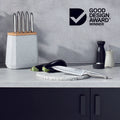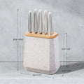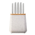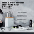 Contains an all-star knife configuration: East/West™ Santoku Knife 17cm (7 inch), Cook's Knife 20cm (8 inch), Bread Knife 20cm (8 inch), Utility Knife 15cm (6 inch), Asian Utility Knife 12cm (4.5 inches), Black & White Terrazzo Stone Block