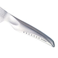 The central layer with cutting edge is of CROMOVA 18 Stainless Steel, hardened to Rockwell 58-59 degrees and honed to a fine edge to give awesome cutting performance. This is sandwiched between two layers of softer SUS410 Stainless Steel material, which helps to protect the blade against chipping rusting and staining. A new, hammered finish is applied to the sides of the blade. This is not purely decorative. The air pockets resulting from this result in a better release of food being cut, giving the blade non-stick properties.