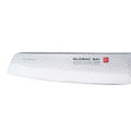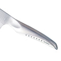 The central layer with cutting edge is of CROMOVA 18 Stainless Steel, hardened to Rockwell 58-59 degrees and honed to a fine edge to give awesome cutting performance. This is sandwiched between two layers of softer SUS410 Stainless Steel material, which helps to protect the blade against chipping rusting and staining. A new, hammered finish is applied to the sides of the blade. This is not purely decorative. The air pockets resulting from this result in a better release of food being cut, giving the blade non-stick properties.