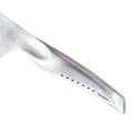 The central layer with cutting edge is of CROMOVA 18 Stainless Steel, hardened to Rockwell 58-59 degrees and honed to a fine edge to give awesome cutting performance. This is sandwiched between two layers of softer SUS410 Stainless Steel material, which helps to protect the blade against chipping rusting and staining. A new, hammered finish is applied to the sides of the blade. This is not purely decorative. The air pockets resulting from this result in a better release of food being cut, giving the blade non-stick properties.