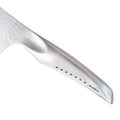 The central layer with cutting edge is of CROMOVA 18 Stainless Steel, hardened to Rockwell 58-59 degrees and honed to a fine edge to give awesome cutting performance. This is sandwiched between two layers of softer SUS410 Stainless Steel material, which helps to protect the blade against chipping rusting and staining. A new, hammered finish is applied to the sides of the blade. This is not purely decorative. The air pockets resulting from this result in a better release of food being cut, giving the blade non-stick properties.