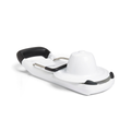 The OXO Good Grips Adjustable Handheld Mandoline Slicer features 3 thickness options: 1mm, 2.5mm and 4mm. The included food holder and stainless steel blade make even slices, every time. A clear surface shows slices accumulating below and the wide ramp accommodates a variety of vegetables. Non-slip notches allow for slicing directly over bowls. Dishwasher safe.