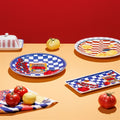 Deep, rich reds, bold blues and mustard yellows colour the Valentina range. Tile-like patterns and geometric contrasts are overlaid with flavour-packed illustrations that speak to a love of food and familiar gatherings. Valentina draws everyone in and around the table. A crisp white porcelain base highlights the delicatessen-inspired motifs while a high gloss finish completes these dining pieces including dinner set, bowls, platters and mugs.