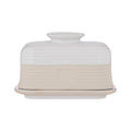 The durable, thick base is designed with parallel ridges ensuring the block of butter stays securely in place. The elegant, embossed lid will keep the contents fresher for longer. Fits up to 500g of butter and measures H10cm x W15.6cm x D10.6cm. Made from Stoneware, the butter dish is dishwasher safe.